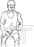 1. Stand with a hammer in your hand as shown, or sit holding on to the rubber band/tubing with your arm supported as shown.